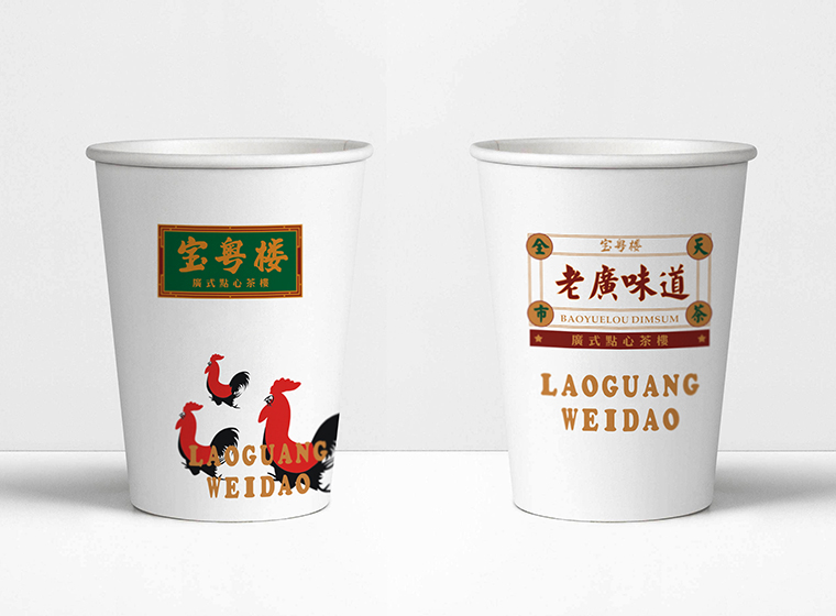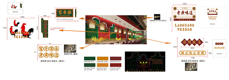 其他的VI如店內(nèi)日常運營的物料系統(tǒng),導視系統(tǒng),推廣廣告系統(tǒng),品深餐飲設計團隊力圖整體空間與品牌完整統(tǒng)一,精細到連顧客接觸最多的墊餐紙、點餐單、使用的功夫茶具、員工的工衣胸牌、圖片的風格,全部統(tǒng)一在寶粵樓的品牌文化體系之內(nèi),給顧客以視覺整齊劃一又靚麗多變的美學感受。