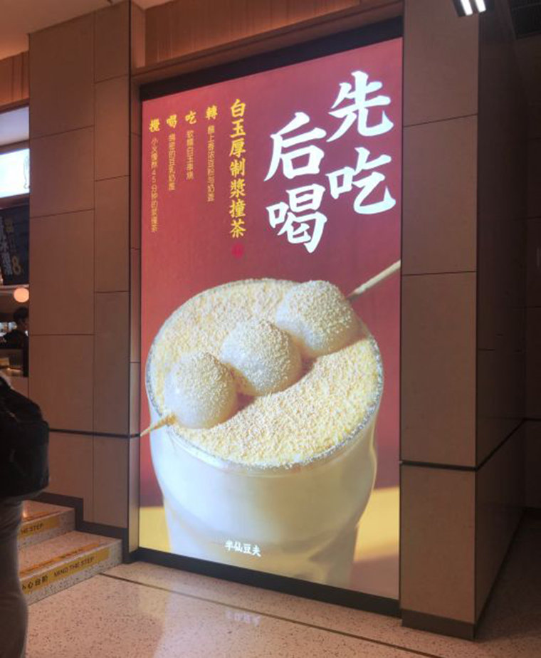 注重儀式感,豆漿出品前用一串日本白玉丸子橫在杯子上,并撒上豆粉,儀式感滿滿,白玉丸子蘸上香濃豆粉與奶蓋,先吃軟糯白玉串燒,再喝綿密的豆乳奶蓋,成功地把豆漿變成能吃的豆乳茶,引來顧客爭相拍照打卡,一時間成為網紅產品。