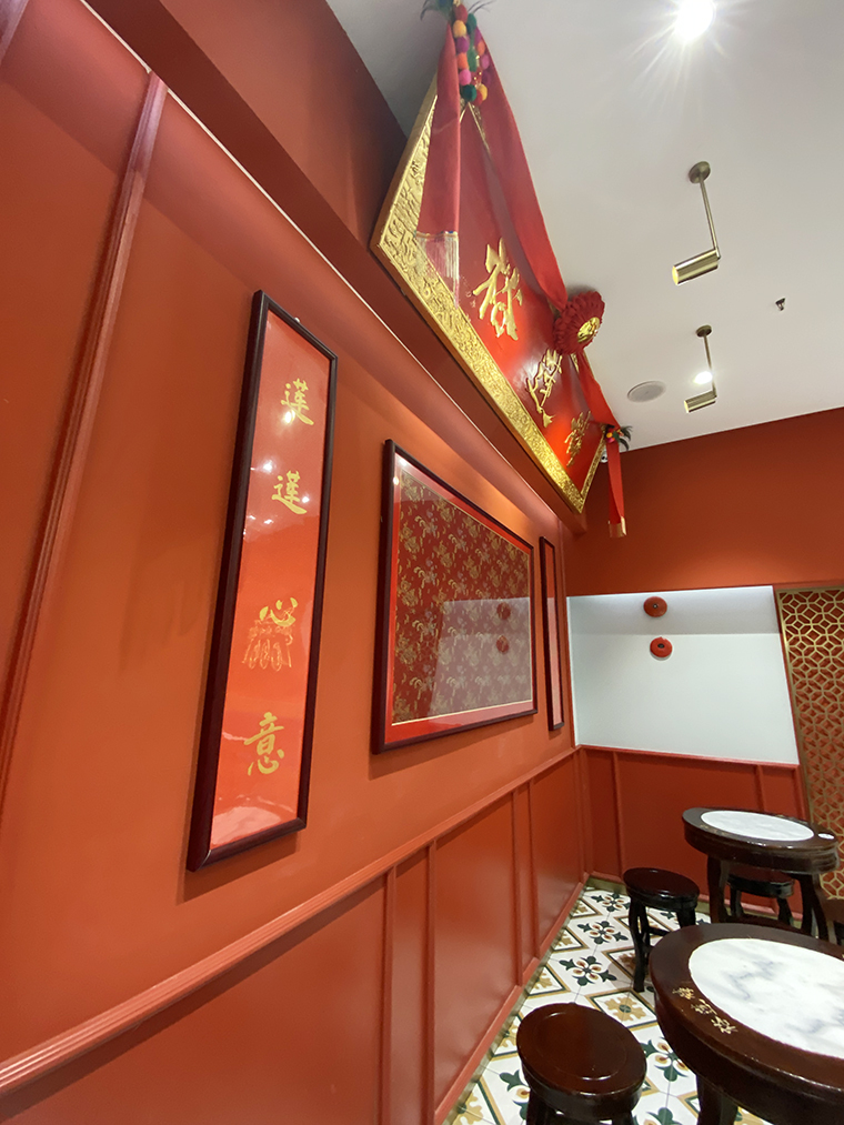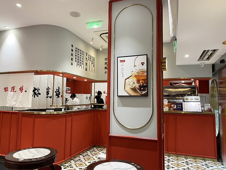 我們通過(guò)對(duì)香港本土糖水店,上海當(dāng)?shù)靥撬箱佭M(jìn)行詳細(xì)的調(diào)研,并結(jié)合當(dāng)下流行趨勢(shì)。我們發(fā)現(xiàn),喝糖水最多的都是女性顧客,糖水有養(yǎng)顏駐顏的功效。我們提取了當(dāng)下最流行的“故宮紅”,將主題定位為“來(lái)自故宮的視覺(jué)盛宴”,整個(gè)門(mén)店大面積紅色和金色搭配,配色熱情而有貴氣。