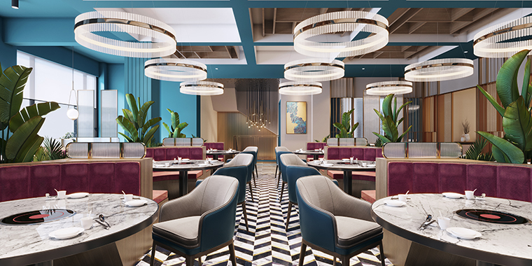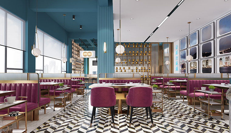 根據行家港式火鍋的品牌定位,我們餐廳的整體氛圍應該輕奢且品質感很強;熱鬧卻不喧囂,精致有特色但容易讓人親近!整個餐廳的色彩以暖色調的不銹鋼金色為主,凸顯火鍋的用餐熱鬧,同時也讓顧客更容易親近,柜體運藍色表達出鮮明的港式風格,同時也點明我們海鮮火鍋的特色。