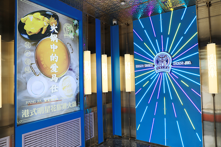 餐廳的主入口處,人流最密集之地,也是品牌首選的亮相之處。展現品牌主形象LOGO,以香港常見的霓虹燈材質,四周放射性線條,極具識別度,既有鮮明的港式風格,又能吸引消費者打卡拍照分享;上樓梯處再用不銹鋼金屬字強調品牌名字“我就是行家”;1樓大廳一整面墻的香港城市景色照片,讓消費者有一種身臨其境的感受;二樓大廳正面形象墻以行家牌匾+立體浮雕醒獅,最經典的港式匾額傳達花膠雞悠久厚重的歷史,兩側喜慶的南派醒獅,吉祥又可愛,與品牌LOGO彼此呼應。