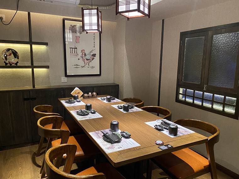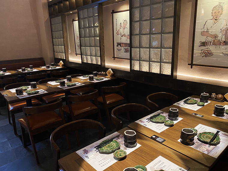 最能體現居酒屋熱鬧感的是大廳,最能感受燒鳥店煙火氣的是燒烤臺前的長吧臺。當我們坐在燒鳥長吧臺前,看著燒鳥師傅熟練地穿串,精準地控制火候,不時地翻動烤串,美味現場呈現,匠傳玉椿的理念就鮮明直觀地傳達出來了。所以,整個大廳都是圍繞著燒烤吧臺這一焦點而展開的,全部為單人椅及兩人座位,位置靈活組合,利用率非常高。