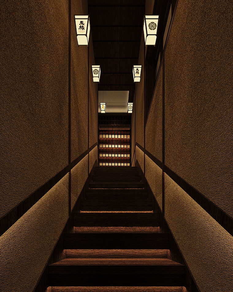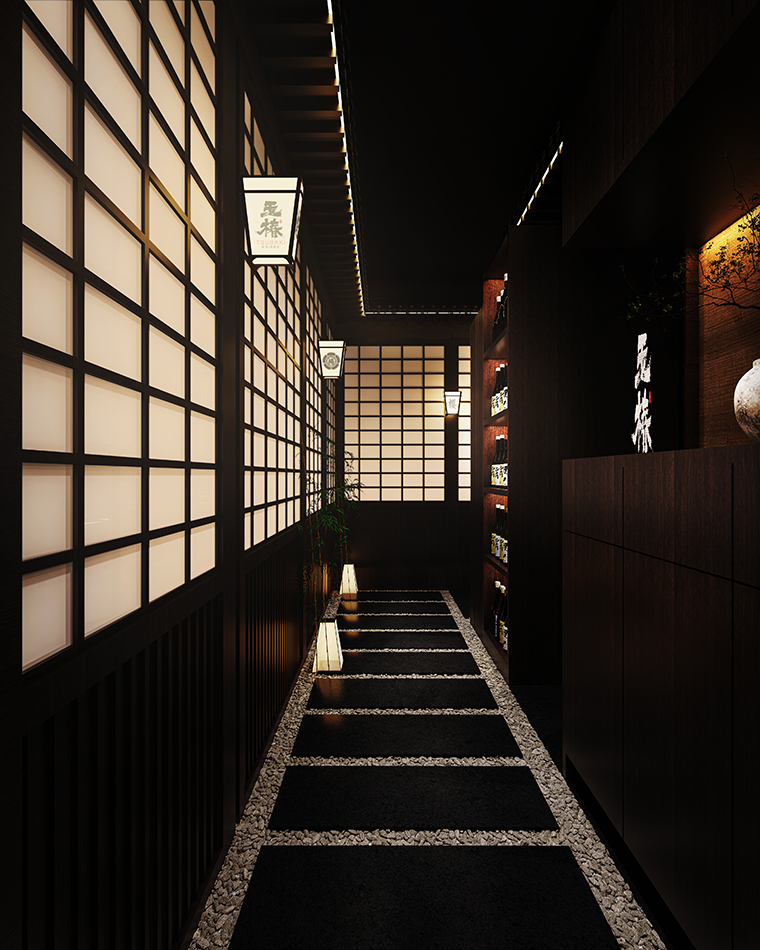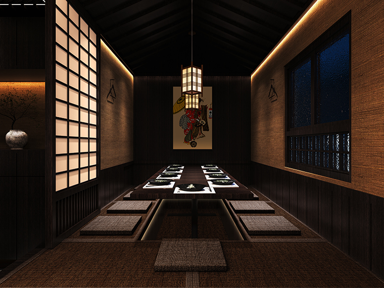 我們從門頭開始到天花吊頂、地面鋪設、墻面涂料、燈光、家具等各方面圍繞“京都味道、匠傳玉椿”來展開步移景異,一步一景的空間效果圖設計。