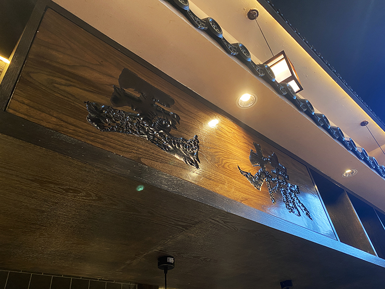 1、門頭及外立面設計:門頭是門店吸引顧客進店的指示牌,在空間展示中占的比例最高。玉椿燒鳥居酒屋的門頭,使用京都古建筑的山墻造型,中間裝飾“椿”的家徽,既表達品牌名稱,又有強烈的復古氣質,極具江戶時代特征。