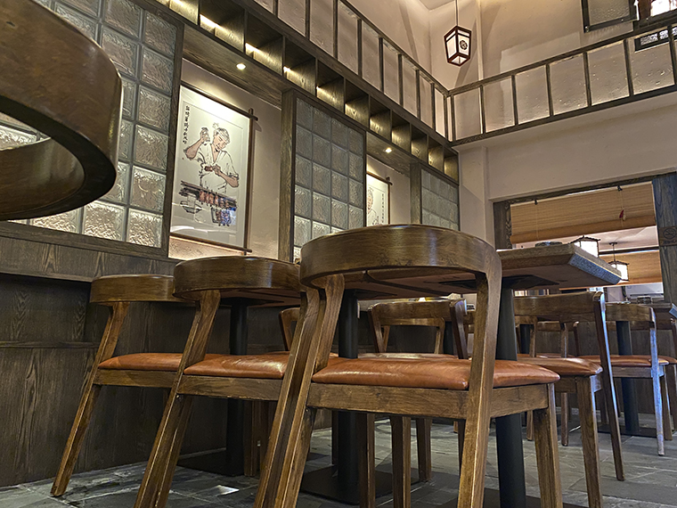 為了營造京都風格的空間感受,品深餐飲為玉椿設計定制的家具采用了實木材質,開放漆做舊工藝處理,呈現出一種江戶時代的歷史滄桑質感;與門店的招牌匾額,儲存柜顏色完全一致,顧客使用時候的歷史體驗感更為強烈。