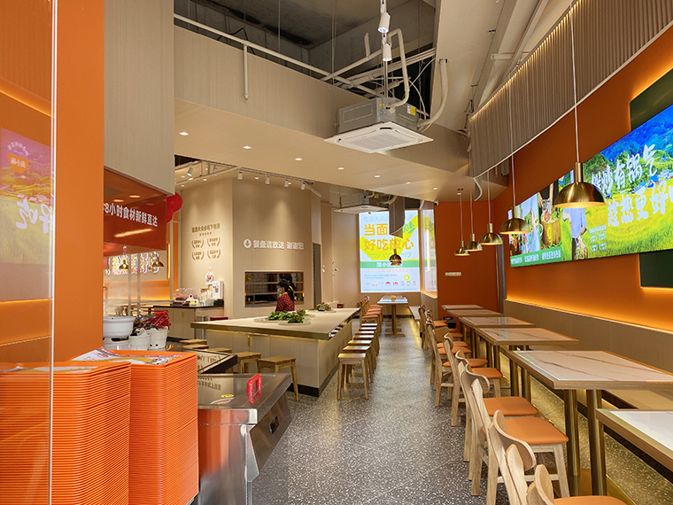 內(nèi)部使用大面積的橙色體現(xiàn)鮮炒有鍋氣的特點,整面墻的木色板材。木色有自己獨特的質(zhì)感、在空間中又更有親和力,在狹窄的簡餐空間中也會讓人感受到輕松,給人一種可釋懷的愉悅,讓人隨時隨地都能感受到大自然的生機。