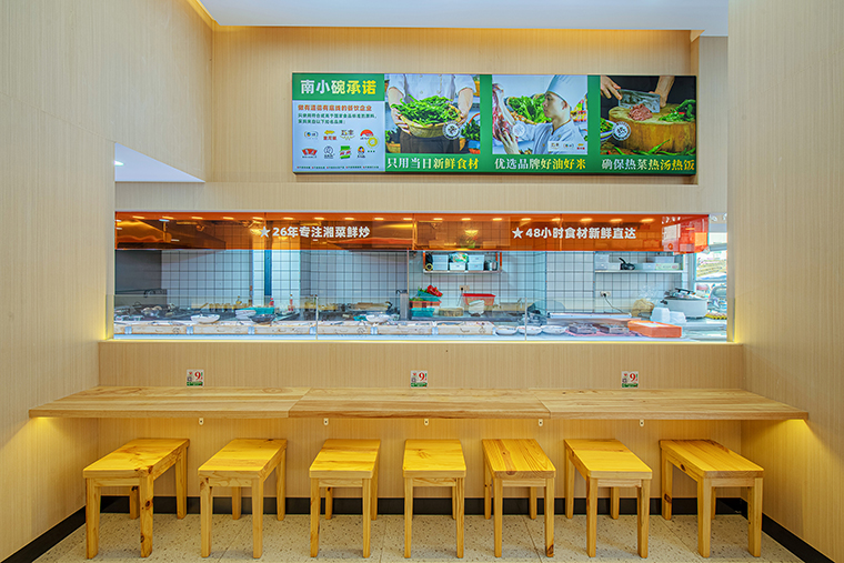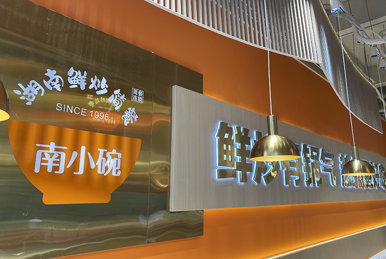 裝飾中再以不銹鋼收口收邊,讓空間更具品質(zhì)感,體現(xiàn)南小碗簡餐的美味放心品質(zhì)。