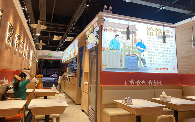 4、品深設計認為,面館本質上與簡餐是一樣的,顧客就是在簡餐和面館之間切換口味而已,所以我們在門店內部沒有過多展示品牌的文化。更多是推廣品牌、推廣產品,圖文并茂直接講清楚,饸饹面是一種什么面食?錢三順是怎么來的?錢三順的核心賣點是什么?我們主推哪些產品等等。