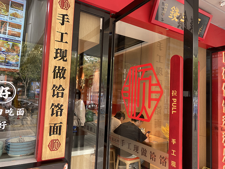 1、從門頭設計到門面設計表達,整個門店設計的重心:手工現做饸饹面,這是我們產品的靈魂,也是我們區別于其他連鎖面館產品的核心。康熙賜名,是品牌故事的傳說,也是饸饹面權威背書的一種方式。與門口張貼的非物質文化遺傳美食相呼應,讓消費者對饸饹面有了認知,對錢三順品牌肅然起敬;